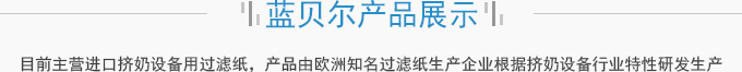 濟南藍貝爾工貿有限公司主要產品擠奶設備過濾紙,牛奶過濾紙,擠奶機過濾袋,目前主營進口擠奶設備用過濾紙,產品由歐洲知名過濾紙生產企業(yè)根據(jù)擠奶設備行業(yè)特性研發(fā)生產,產品符合歐盟食品接觸標準及FDA食品接觸標準,產品在擠奶設備過濾紙行業(yè)占有70%以上的份額。并通過了SGS標準技術檢測中心按國標食品級標準進行的檢測。產品適用于各種擠奶設備品牌,本公司目前獲得該區(qū)域產品營銷資格。產品已用于國內各大乳企所屬牧...